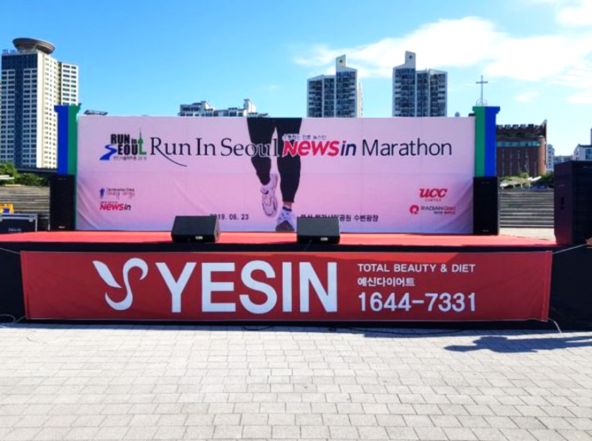 수변광장 일대에서 열린 가운데, 이날 마라톤을 후원한 예신다이어트(회장 김모정)의 플랜카드가 메인 무대에 설치되어 있는모습입니다.