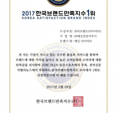?JTBC PLUS , 일간 스포츠에서 주최 하는 한국브랜드만족지수 조사에서 (주)예신건강가꾸기의 브랜드 "예신다이어트"가 1위로 선정되었습니다. 성원에 감사드리며, 앞으로 더 큰 신뢰와 노력으로 최선을 다하는 예신이 되도록하겠습니다.