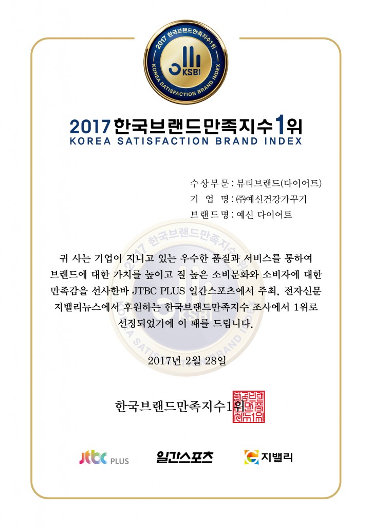 2017 한국브랜드만족지수 1위 수상 본문 ?JTBC PLUS , 일간 스포츠에서 주최 하는 한국브랜드만족지수 조사에서 (주)예신건강가꾸기의 브랜드 "예신다이어트"가 1위로 선정되었습니다. 성원에 감사드리며, 앞으로 더 큰 신뢰와 노력으로 최선을 다하는 예신이 되도록하겠습니다. 이전글 2017 한국브랜드만족지수 1위 수상 현장 17.03.02 다음글 KAVA 가족의밤 신년회에 예신도 함께 했습니다 17.02.02