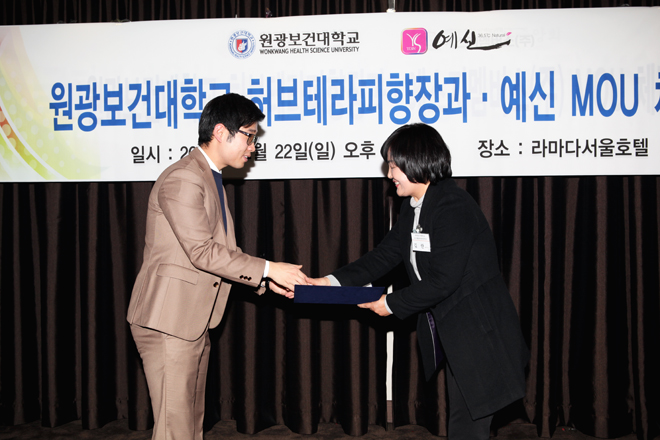 예신, 원광보건대학교 허브테라피향장과 MOU 체결 본문 보건 의료분야의 전통과 사회실무, 공업, 예능분야의 특성화된 인제를양성하고 전인교육으로 실용적인 지식과 기술을 연마하여 공동체 구성원으로서국가와 사회발전에 기여할 중견직업 양성을 목적으로 하는 원광보건대학교와예신이 지난 12월 22일 라마다서울호텔에서 MOU체결식을 거행하였습니다.세계적 수준의 전문대학으로 선정되고 교육부선정 3년 연속 교육역량강화사업우수대학으로 선정된 원광보건대학교 학생들과 예신의 발전을 기원합니다. 이전글 [예신 촬영협찬] 황금무지개 16화 15.04.09 다음글 예신의 새로운 그녀가 온다? 15.04.09